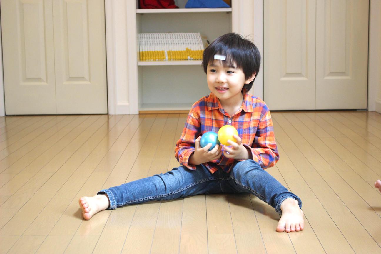 英語で掛け声をしながら転がってくるボールをお尻歩きでかわそう!誰が最後まで逃げ切れるかな!?